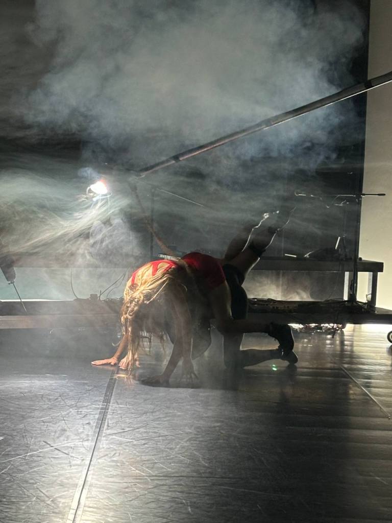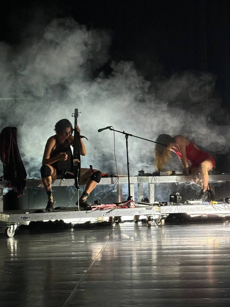 Two geo-diverse bodies mess with the seasons and forget the secrets of sowing seeds, morphing movement composition with live experimental music on cello and violin, voice and synth looping, they interweave surreal agrologistic* surroundings by taking and losing control of their environment and body.